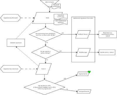 One thing this means is that uploads of shim require a lot of effort and testing. Fortunately, since it is used by other distributions too, it is a well-tested piece of code. There is even now a community process to handle review of submissions for signature by Microsoft, in an effort to catch anything outlandish as quickly and as early as possible.